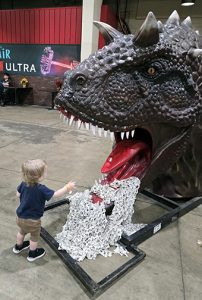 Oddly, some of the best parts of Brick Fest were hidden – a couple of small building tables and a LEGO drag race track tucked away in the exit hallway, which we only found on our way out. Still, for a LEGO-obsessed kid it was heaven. And for a toddler who just discovered dinosaurs, it was like meeting his new best friends.