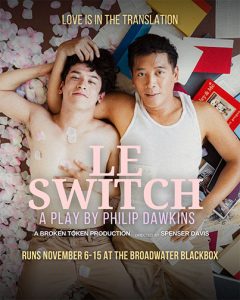 Written by Philip Dawkins and directed by Spenser Davis, it runs Nov. 7 through Nov. 15 at the Broadwater Blackbox in Los Angeles. For tickets, visitwww.onstage411.com/leswitch.