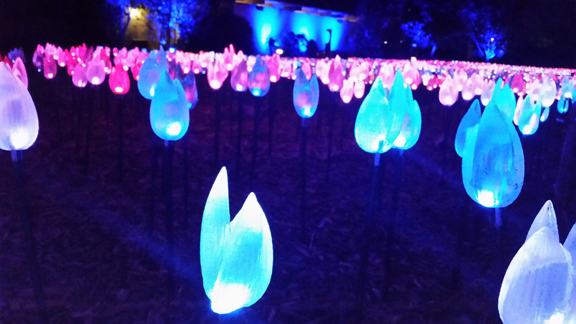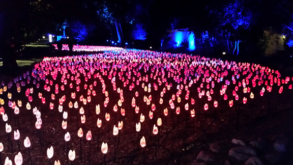 Enchanted: Forest of Light is an interactive nighttime experience. The Gardens are divided into 10 separate areas, each showcased by different lighting and or techniques. The first display ticketholders will find on the one-mile walk is Flower Power. It encompasses thousands of illuminated tulips awash in radiant colors that constantly change and are accompanied by soothing music. The Symphony of Oaks is reminiscent of the game Simon, with platforms under each tree that guests can step on, creating unique light patterns. Those in need of rest can take a seat on one of the many lighted benches in the area. The Ancient Forest, Descanso’s newest garden, is like stepping back in time when dinosaurs walked the earth. It centers on a collection of cycads that includes more than 180 plants representing 60 varieties including several endangered species. Slowly changing lights on the giant trees and ferns have visitors listening for thunderous footsteps in the distance. Amid these exhibits guests will find the Gardens’ Heritage oaks, bathed in white light.