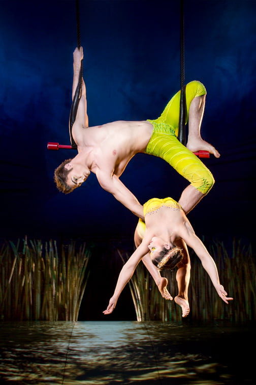 We sit in the dark, watching the stage. A couple are sitting on an acrobat’s swing 20 feet off the ground. She stands up, he repositions. And then she jumps off. She falls for a split second, caught by her partner who has saved her in the instant before she is out of reach. And then, instead of pulling her back up onto the swing, he lowers himself down, hanging off the swing by only his toes, letting his partner dangle beneath him. This is Cirque du Soleil.