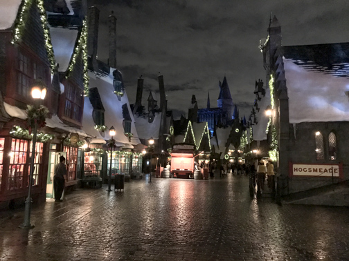 My favorite part of Christmas in the Wizarding World of Harry Potter, perhaps of the entire Wizarding World Land, is The Three Broomsticks. This eatery offers traditional pub fare and, as though that’s not enough, for Christmas it has added a holiday feast. Roast turkey and celery-sage stuffing with gravy and cranberry sauce, pigs in blankets, steamed vegetables, braised red cabbage, roast potatoes and for dessert – Christmas pudding with brandy butter. That’s all for one person! That’s your dinner. And just like everything else at The Three Broomsticks, it’s so good. USH has established itself as a culinary destination in recent years with the addition of great in-park restaurants like Three Broomsticks, Krusty Burger in Springfield (Simpsons Land) and the now-iconic 10-inch wide donut, the favorite snack of Homer Simpson, at Lard Lad Donuts.