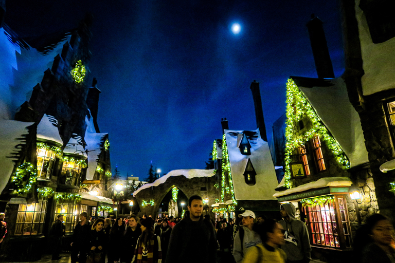 Around the corner in Hogsmeade, Christmas is in full swing. Snow-capped roofs are complemented this time of year with brightly-lit garlands and wreaths. Hot butterbeer flows to every cup and the sound of a magical frog choir croaking out holiday favorites dances through the air. The Wizarding World of Harry Potter lights up at night with Christmas decorations and brings back its annual Christmas show –The Magic of Christmas at Hogwarts Castle. This six-minute show brings Hogwarts Castle to life through projection technology that maps the façade with Christmas ghost carolers, dancing lanterns, house-specific snowmen and Christmas trees. Walls slide away to reveal the inner workings and chambers of the ancient castle. While the runtime is short, the show is really not to be missed. It’s a spectacular nighttime experience that rivals most shows with longer runtimes at other parks. The Magic of Christmas at Hogwarts Castle runs approximately every 30 minutes after sunset.