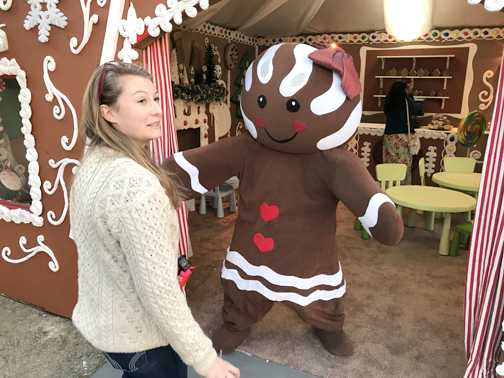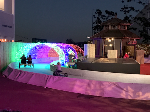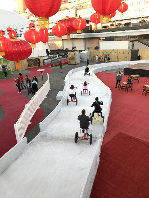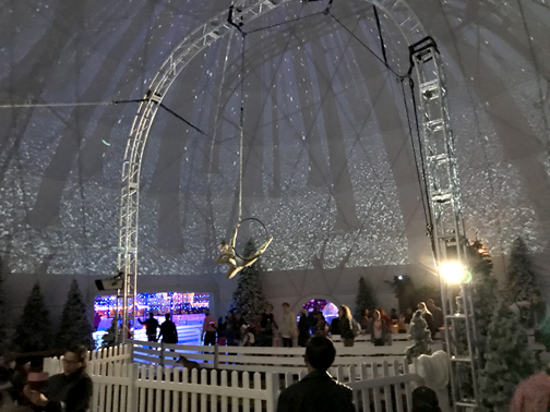 The event overall is really cool, no pun intended. It is a wintery trip around the world, visiting snowy places and experiencing some of the best that cold weather has to offer. For Californians, this is a rare occurrence but even for visitors who have frozen lakes at home this is an experience done right. I was amused just to see a frozen rink and get to ice skate. But to make it even better, it has built a skate-up bar with Sugar Plum Martinis and performing aerialist dancers on an ice track that winds around the event between other attractions to enable skate sightseeing. There are bumper boats on ice, an ice slide, ice bikes (tricycles with ice-gripping wheels), a zip line, stocking making, gingerbread house building, an all-you-can-eat waffle buffet, a Chinese tea house, a 4D theater show and more international foods than an airport food court. It’s a great time and something not found anywhere else in LA.