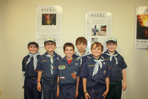 On Friday, Jan. 23, the Bears from Pack 360, Den 8, visited the offices of the Crescenta Valley Weekly. They came to learn how the newspaper is made. There were six boys visiting plus two brothers and two sisters. The scouts – Caden, 9, Elias, 8, Matthew, 8, Riley, 9, William, 8, and Zachary, 9 – attend local elementary schools including Columbus, Dunsmore, Monte Vista, Valley View, Mountain Avenue and Fremont. The brothers who came were Connor, 10, Alexander, 6; the sisters who joined the excursion were Leah, 6 and Jennifer, 15. Some of the parents came, too, with Den Leader Leslie Dickson and Cubmaster John Jucksch.
