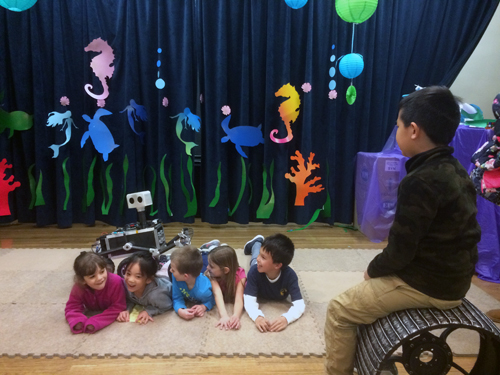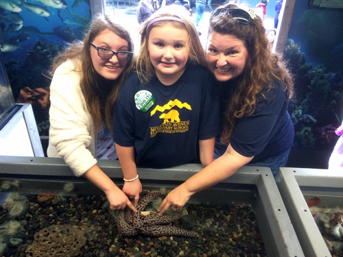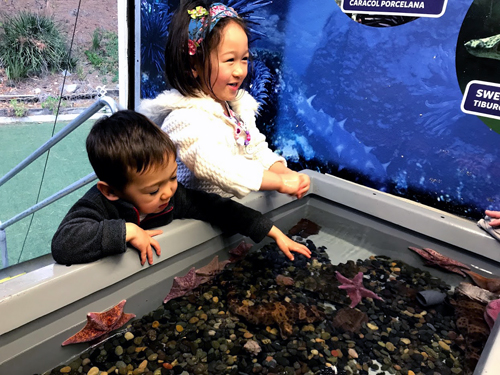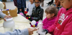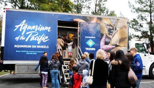 One of the highlights of the Science Fun Fair was the on-site Aquarium of the Pacific mobile aquarium touch tank, housed in a semi-truck parked on the kindergarten play yard. Kids and parents loved seeing and touching the sea creatures. There were rough-skinned small sharks, prickly purple sea urchins, colorful sticky sea anemones, bumpy sea stars and smooth sea snails.