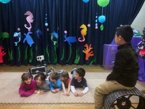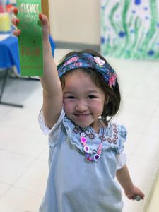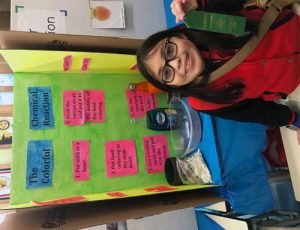 One team project, Project Mc2, explored food science activities. Alisha Singh, a second grade student who worked on Project Mc2 also did a team project with her little sister, kindergartener Alina, describing “How Wood Becomes Paper.” Other projects explored electricity, germs, volcanoes, geodes, wind power, solar power, slime, circuits, lemon or potato batteries, seed germination, trains, tornadoes, DNA, cleaning pennies using a vinegar chemical reaction and making a robotic hand. In addition there were static wand fly sticks that could float tinsel shapes, whirlpool tubes, dry ice fog bubbles and an air cannon. The air cannon showed the power of wind and how it can make waves across ocean water. There were also fun sea animal crafts and origami, a Cartesian diver nicknamed “Squiddy” that used air pressure to move up and down when a bottle is squeezed, a plasma globe, and an ocean-in-a-box display that held a variety of ocean shells, sand dollars and a dried seahorse. In another room, there were two microscopes where students could look at moving microscopic plankton from actual seawater. There were also other interesting specimens to look at under the microscope. Some students also tried pH testing to measure the acidity or alkalinity of various solutions such as lemon juice, orange juice, milk, water, seawater, soapy water and a baking soda solution.