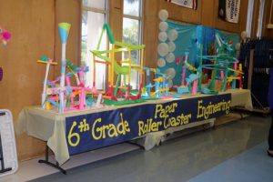 There were more than 150 students who entered science projects. In addition, 40 sixth-grade students competed in the “Great Paper Roller Coaster Engineering Challenge.” The goal was to design and build a roller coaster made out of paper cardstock and tape that could keep a marble rolling down the coaster the longest. The students worked in teams of two to four people to complete the coaster, learning about engineering design and physics principles such as inertia, momentum, velocity, energy and acceleration in the process.