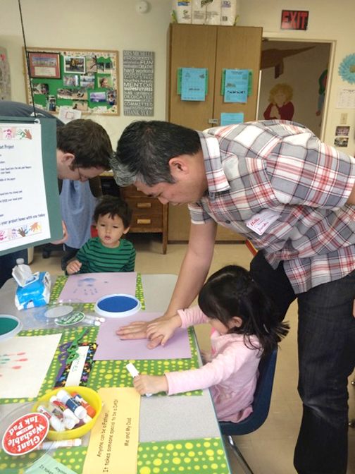 Dads could be found playing blocks on the floor, singing songs, doing crafts led by their child, eating snacks with everyone smiling from ear to ear. The dads in the Busy Bear  class had their feet painted by their child and made a keepsake that said “I’ll Follow You Anywhere.” In the Darling Duckling class, preschoolers were helping their dads get their hands messy with ink to make handprints. Their project had the hands of both the dad and child overlapped and read, “Anyone could be a father, but it takes someone special to be a dad.”