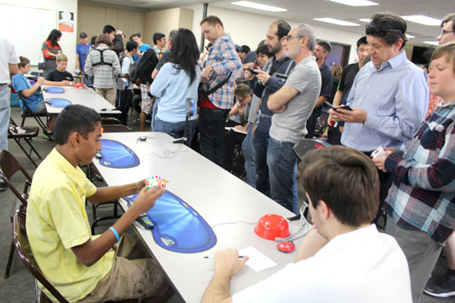 For the 3×3 (regular style Rubik’s Cube), the winner was James Hamory with an average of 9.66 seconds for his five attempts at solving the cube during the final round (top 16). Second place was Nathan Soria and third was Shane Grogan. The 4×4 winner was Nathan Soria with an average best of 38.52 seconds. Shane Grogan was second place and third was Samuel Chiu.