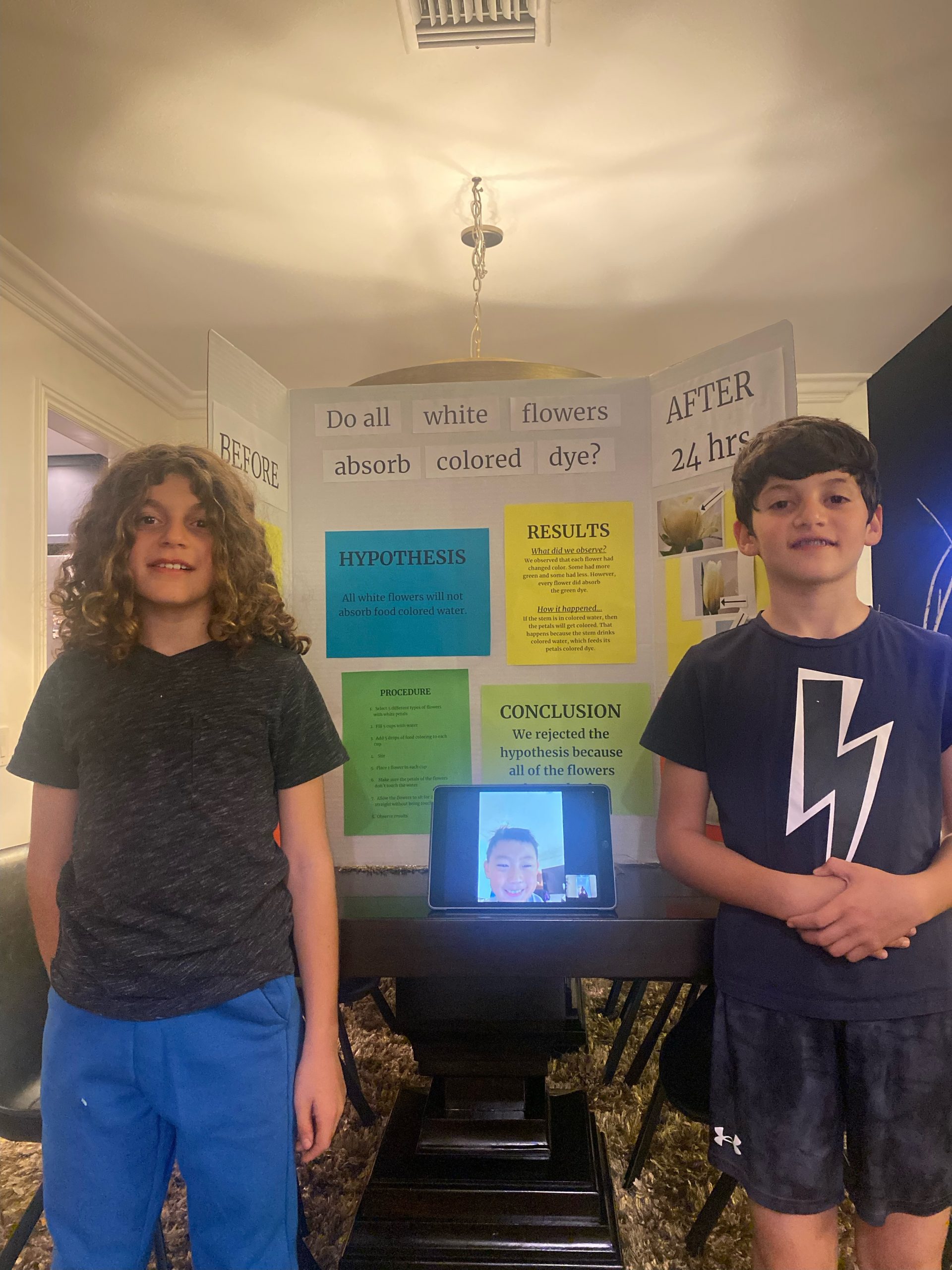 The students covered a variety of topics with their projects. Alex Gharibian, Chris Gharibian and Trevor Kim presented a science project titled “Do all white flowers absorb colored dye?”