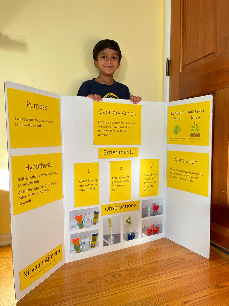 “Capillary Action is the ability of liquid to flow upwards in narrow spaces without assistance,” explained Nirvaan. “I was curious to know how plants get water up to their leaves. I initially thought plants suck water up like we do with straws, but while working on my project I learned that capillary action causes water to go up through the plant’s stem.”
