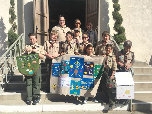 At the end of Mass at Holy Redeemer Church on Scout Sunday, Feb. 4, with members of Verdugo Hills Council units including Troops 303, 317, and 315 in attendance, Webelos 1 & 2 received their medals. Fr. Ed, assisted by Maureen Brown from the Catholic Committee on Scouting, awarded the Parvuli Dei Religious Emblem to the following Cub Scouts: Andrew Harrison, Chris Lessa, Ethan Kwon, Felix LaPointe, Hagen Close, James Simmons, Marc Novoa, Mikey Harrison, Sebastian Brown and Teejay Gonzalez.