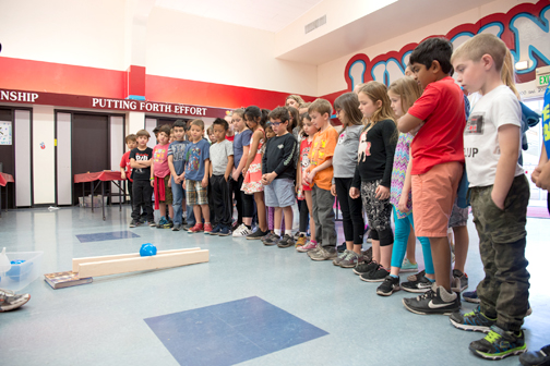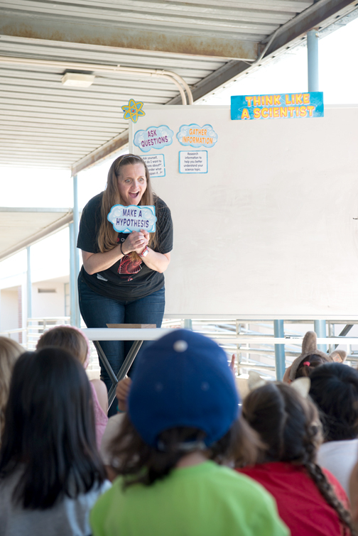 Walch’s excitement and love of science and exploring embraces the students as she greets each class, revealing what awaits them inside the auditorium while explaining all the cool, fun, hands-on experiments that they will get to try during the exhibition. She inspires them to ask questions, make a hypothesis and conduct experiments on subjects that they are already interested in, or want to learn about, and enter their findings into the Science Fair.