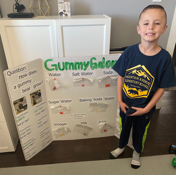 “It was really fun to choose all the ingredients for my project, ‘Gummy Galore!’ I like that I was right about my prediction, or hypothesis,” he said. “The gummy bear project looked really fun and I wanted to see which one would be the biggest when I soaked gummy bears in different liquids. I really liked doing experiments!”