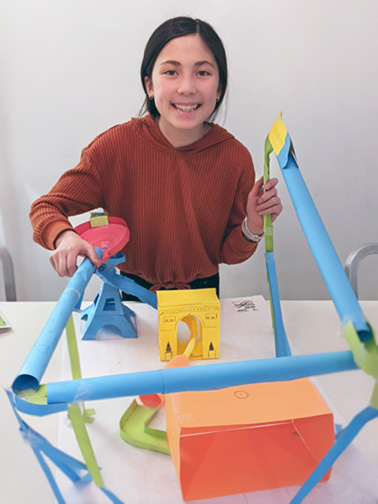Sixth graders Audrey Chung, Avril Clementel, and Abbie Davidson tied for the best theme. Audrey’s coaster was titled, “A Trip Through Paris” and included the Eiffel Tower, Arc de Triomphe, and a baguette shop all made out of cardstock paper. Avril and Abbie’s paper roller coaster was named “Sun Snake Road.”