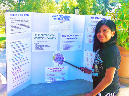 “I like to investigate what I see and feel,” said Bianca. “My favorite part about the Science Fun Fair was learning and researching my topic. I wanted to do a science project that can help us deal with some of the stress of COVID-19 quarantine. Like most students at Mountain Avenue Elementary, I am enrolled in distance learning. I miss seeing my friends, teachers and other staff. I miss being in the classroom and playing with my friends in school. Life is so different now and sometimes I feel stressed. I think other students may be feeling stressed, too. I like learning about the brain because it is so incredible. The brain is the center of the human nervous system, controlling our thoughts, movements, memories and decisions. I focused on deep breathing and the brain. I wanted to share what happens to our brains when we are stressed and what we can do to help our brains deal with stress.
