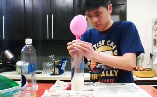 Chemistry Club co-president Seon-Jae Yoon had a ping pong ball demonstration in which she blew air on the ping pong ball to move the ball from one cup to the other. Co-president Matthew Jang showed the audience how to make different kinds of slime and explained the chemical reaction behind the gooey process. Chemistry Club member Nara Sirkanian made an oobleck demonstration using cornstarch and water. Hyun-Tae Yang showed an experiment with vinegar and baking soda in a plastic bottle to blow up a balloon through the expanding carbon dioxide gas created from the chemical reaction. The high school Chemistry Club advisor is Julie Patton. (For more information about the CVHS Chemistry Club, see the CV Weekly Feb. 11 issue).