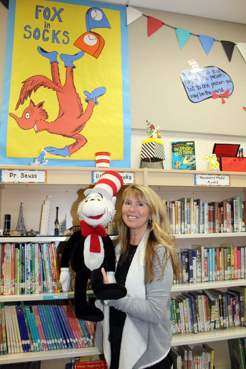La Crescenta Elementary School librarian Carole Mulder stretches “Dr. Seuss Day” through the entire month of March. On Tuesday, she was accompanied by the Dr. Seuss character The Cat introduced in the book “The Cat in the Hat.”