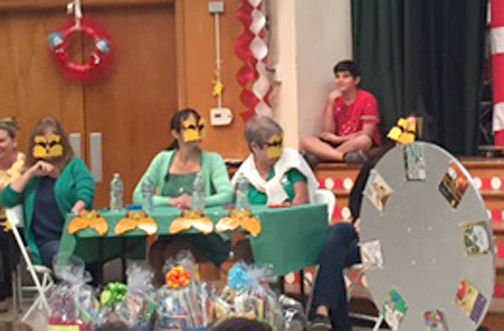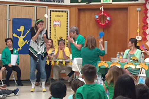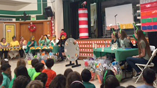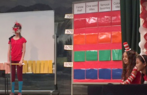 The theme of the assembly was game shows hosted by the one-and-only “Cat in the Hat.” Teachers in groups of three were put into two teams, named the Daisy Headed Mayzies and the Loraxes. A Jeopardy-style board with categories such as “One Word Titles,” “Famous Favorites” and “Colorful Titles” were offered to the participating teachers. Answers presented included “A little monkey and a man in a yellow hat” and “The book is about a bunny that can’t fall asleep until he says goodnight to his moon.” When each teacher asked the corresponding question correctly, the elementary school students watching the assembly cheered enthusiastically.
