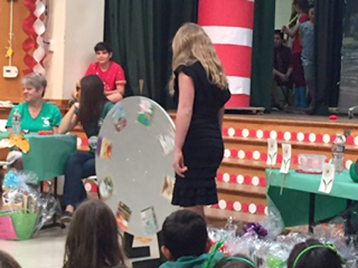 Another aspect to the assembly was a spinning wheel placed in front of the auditorium’s stage. Famous children’s book such as Louis Sachar’s “Holes” and “If You Give a Mouse and Cookie” were printed on the wheel. When the wheel was spun to a certain title, two teachers had to eat a type of food, which represented the book’s title, as quickly as possible.