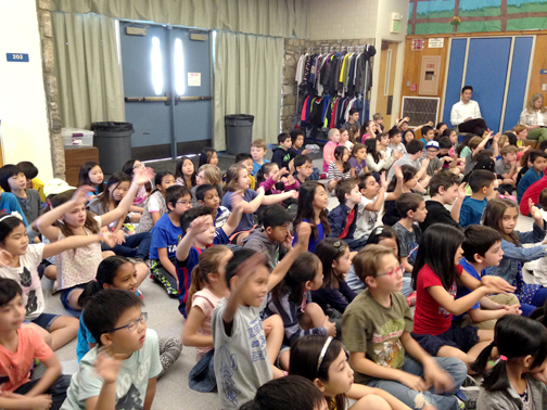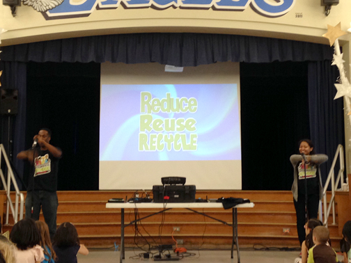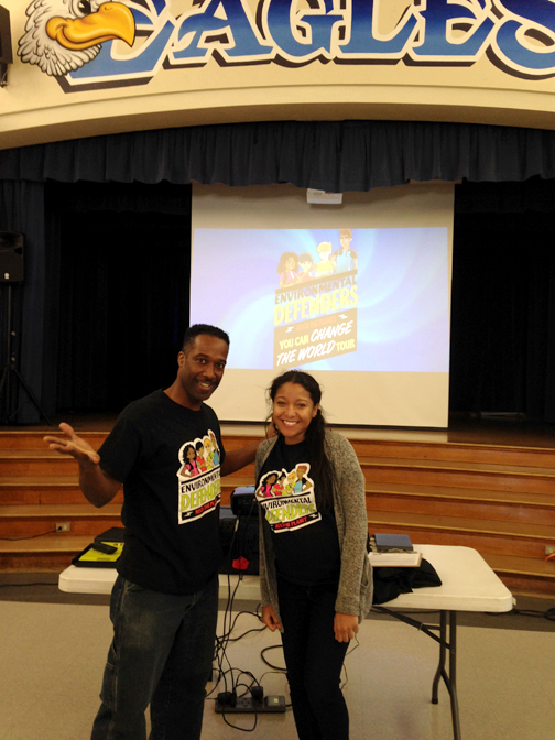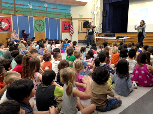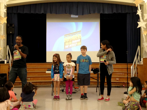 The Environmental Defenders rocked Valley View on March 9. This 30-minute, high-energy assembly program taught students in grades kindergarten through six to identify environmental problems and possible solutions that students can do to reduce pollution. The assembly was performed by two professional children’s theater actors, Al and Polly, and their animated friends, the Environmental Defenders. The focus was on the 4 R’s (Reduce, Reuse, Recycle, and Rethink), storm water pollution prevention, household hazardous waste and water conservation. The assembly was sponsored by the County of Los Angeles Dept. of Public Works, and presented by Valley View’s PTA.
