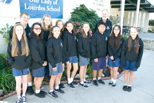In March, junior high students from Our Lady of Lourdes Catholic School in Tujunga represented themselves well at the Los Angeles Archdiocese Academic Junior High Decathlon (AJHD). Held at the California State University-Long Beach Walter Pyramid, the AJHD was attended by thousands of spectators who came to watch 106 Catholic schools and more than 1,000 students test their academic ability in the Logic Quiz and the Super Quiz, as well as individual tests that included knowledge testing of religion, literature, science and current events, among others. Awards were given for individual and team performance. The day-long event included an opening ceremony, afternoon Mass and a concluding award ceremony.