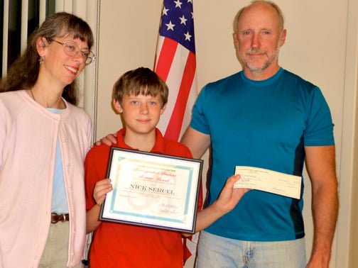 Nick Sercel, seventh grade student at St. Bede the Venerable Catholic School, holds his Distinguished Student Service Sward. He is flanked by his proud parents Nick and Cindy Sercel.