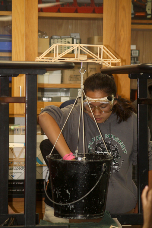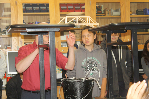 Prior to each challenge, physics teacher Gerald Gruss held up the entrant’s bridge so students could see the design. The bridge was suspended between two desks and a bucket holding some foundational weights was attached to the bridge, then one-by-one weights of one kilogram were placed into the bucket. Around the room whispers of “Oh, no” and “How much will it hold?” was heard. Some students giggled and others held their breath as the number of weights increased. At each placement, the bridge builder covered his or her eyes or held up their hands in an invisible support of their creation. Then the final weight would be placed, whether it was the eighth or 13th, and the sound was heard of splintering wood.