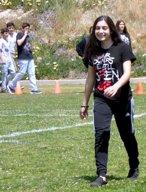 During the school’s lunch period, seventh and eighth grade students who wished to participate joined faculty and staff on the upper field, grabbed their lunches, dropped their backpacks, and assembled into walking, talking study groups, each with a student moderator, some with Armenian flags and banners.