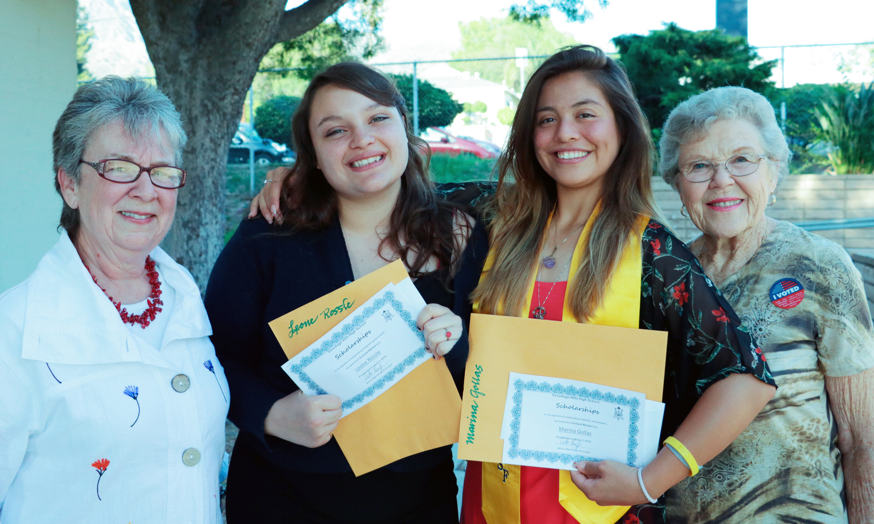 On June 5, Leone Rossle and Marina Gollas, graduates of Verdugo Hills High School, each received $1,000 scholarships from the Sunland Woman`s Club presented by Linda McCollum, out-going director of Philanthropy, and Sheila Feuchtinger, the incoming director of Philanthropy. These scholarships are given annually to students in the Crescenta Valley school district who plan to attend either college or a trade school. Any student interested in these scholarships for next year should check with their school’s counseling office.