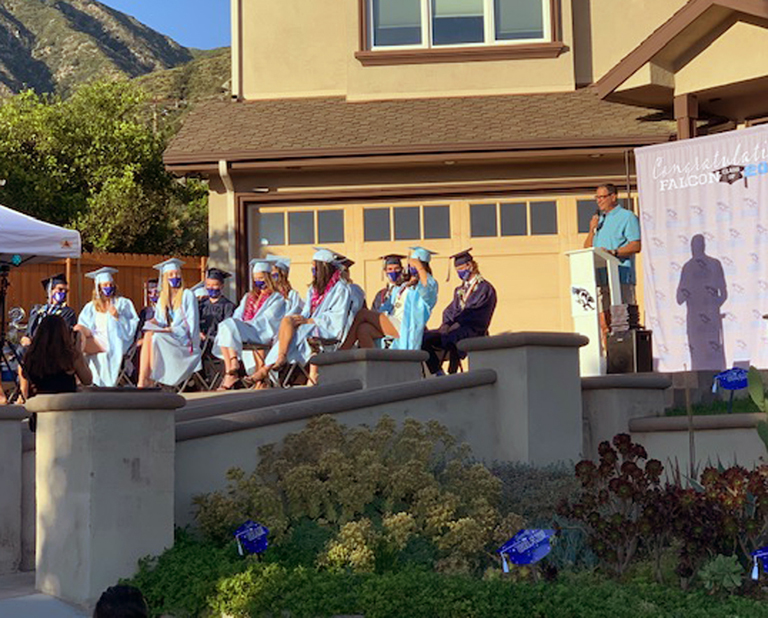 La Crescenta local Debbie Meyer’s son Charlie was part of the Crescenta Valley High School Class of 2020. With the help of other CVHS parents who had graduating students, Meyer invited friends and neighbors to her home to watch as about 15 students in cap and gown had their names and accolades read, then received their diplomas.
