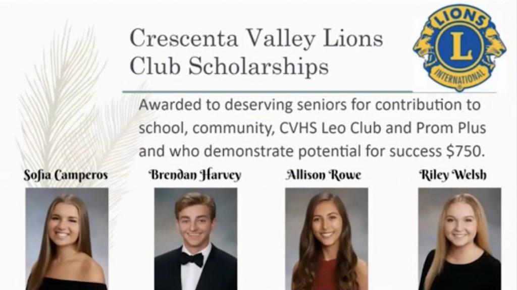 In a virtual scholarship presentation, the Crescenta Valley Lions Club awarded scholarships to four outstanding, community service-minded seniors from Crescenta Valley High School. A fifth award was presented jointly with Prom Plus to another deserving CVHS senior.