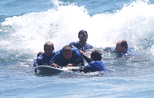 Then, just like all surfers, they wait for that perfect wave and, with the help of a volunteer guiding the board, they ride the wave to the shore where the shallow water volunteers grab the board, turn it around and the surfer goes back for another wave.