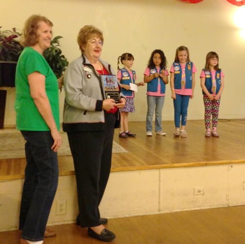 Marianne Jennings, Daisy troop leader, looks on as LCWC president Carol Huntwork displays a plaque of appreciation presented to her by Girl Scout Daisies.