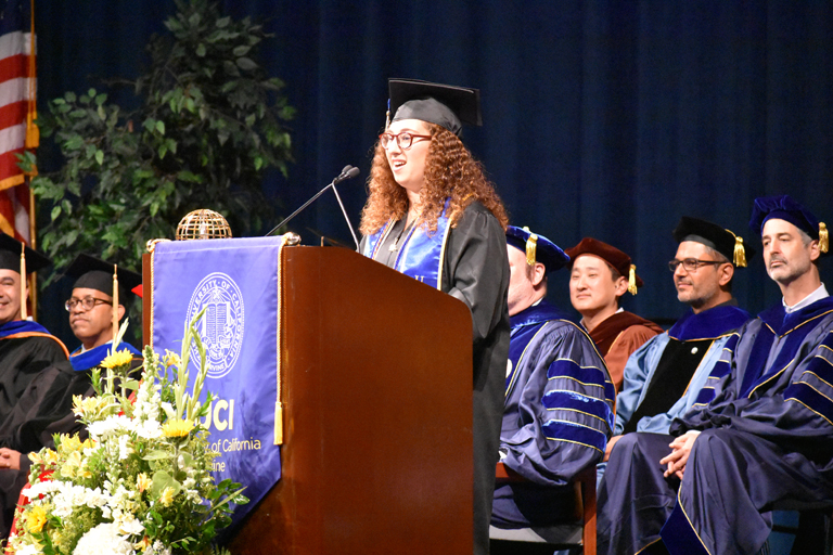 Sarkissian asked everyone to reflect on their “firsts” at UCI and how every step and experience helped them grow and become who the people they are today. She encouraged them to volunteer back at the UCI community and give back to others. She also reminded everyone to express gratitude to family, friends, faculty and mentors for their support and guidance. At the end, she quoted her grandpa’s encouragement throughout college, from starting as a 10% engineer the first quarter to becoming a 100% engineer at the end of her journey.
