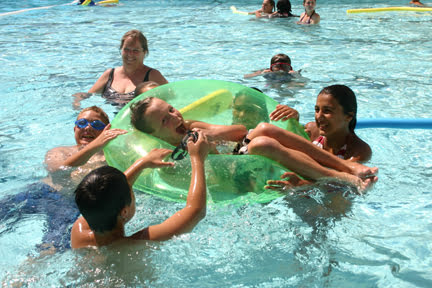 Kids were using noodles and donuts to float themselves from one side to the other. There were underwater flips and turns as friends enjoyed the cool water on the hot day.