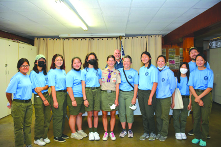 Showing their support at the Aug. 13 meeting were fellow Scouts from her troop – all clad in blue shirts – along with Kendra, scoutmaster of Troop 360, and Emelia’s dad Ted.
