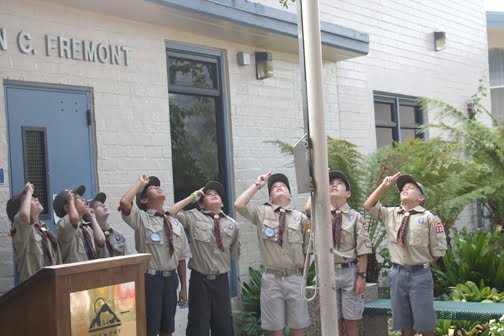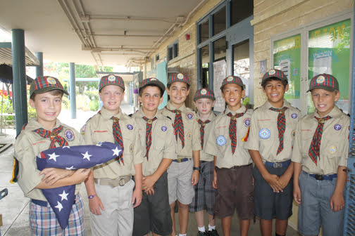 Sixth grader Q Flanagan-Gorham conducted the ceremony as Cub Scout Pack 304, Den 4 raised the American flag. Cub Scout members in attendance were Owen Clark, Jackson Bullard, Jared Noh, Nick Martin, Mason Allen, Nikolai Pravikoff, Brian Harley, Matthew Regan and leader Flanagan-Gorham.