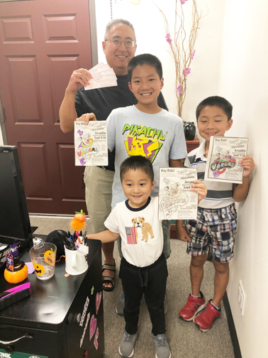 The Hayashi brothers – Alex, 4, Jacob, 8, and Shawn, 11 – hold up their winning artwork while dad displays the tickets.