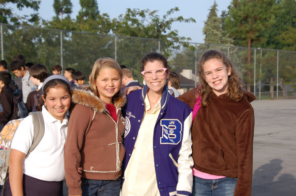 Tricia Flynn (in letterman jacket) poses with St. James sixth graders (from left) Emme Yekikian, Camryn Christensen and daughter Sydney Flynn. Photo courtesy of St. James