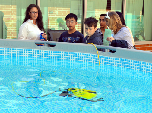 Clark Magnet High School science teacher Dominique Evans-Bye watches students operate an underwater ROV during an Open House event.