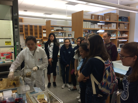 Using a microscope, Academy students observed the changes to livers from mice fed a high-fat diet, resulting in fatty liver and obesity. Students also were able to see how researchers can measure overall body composition in mice using a “mini-mouse MRI” or Magnetic Resonance Imaging machine built specifically for animal models. Students saw a tissue culture room with cell culture lines, and spoke with graduate students who are unraveling the mysteries of DNA to determine novel genes in lipid and glucose metabolism to find underlying causes and cures for heart disease, diabetes and obesity.
