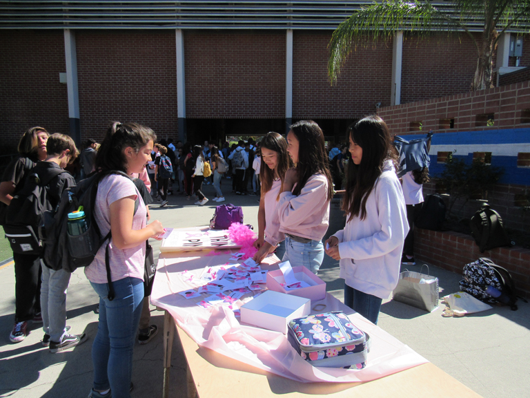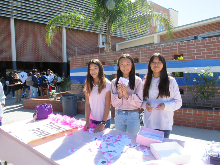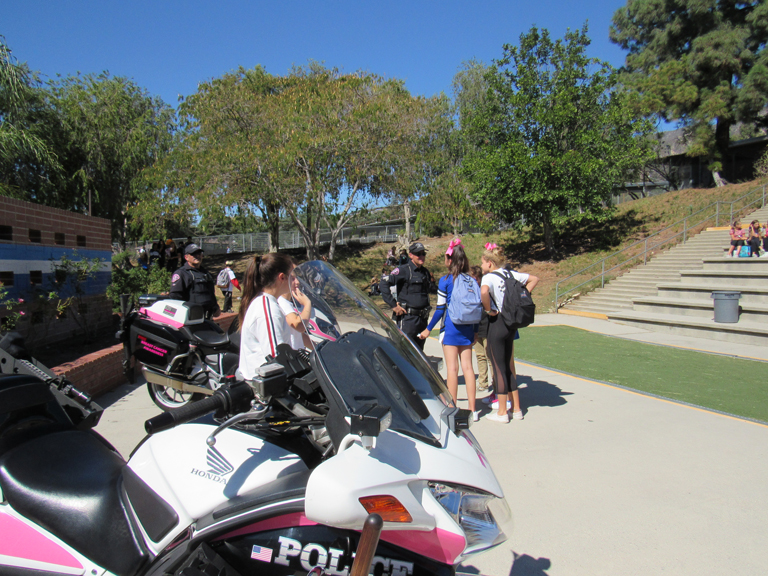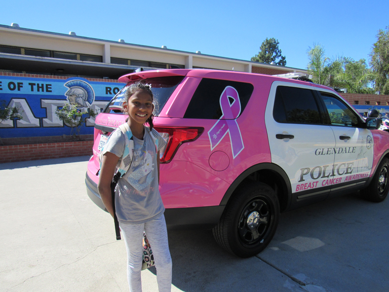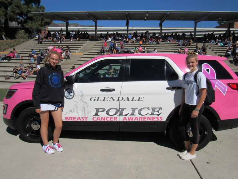 The Glendale Police Dept. stopped by Rosemont Middle School recently with its pink patrol vehicles and motorcycles to bring attention to October’s Breast Cancer Awareness Month. GPD was at the school during lunch and was a perfect companionship event with Girl Scout Troop 1591 and its Silver Award project. Girl Scouts, and eighth graders, Sooji Kim, Evelyn Kapae and Stephanie Harada handed out breast cancer informational cards decorated with pink ribbons to students and teachers.