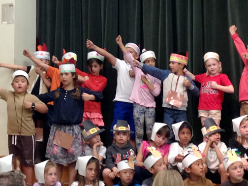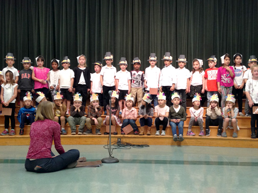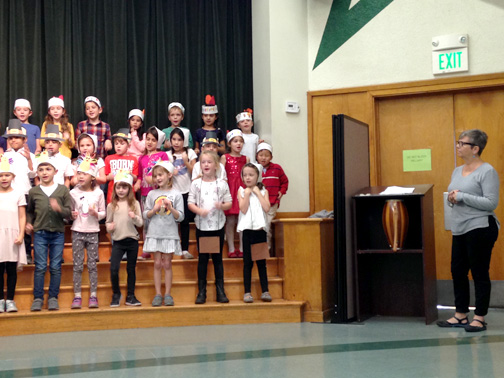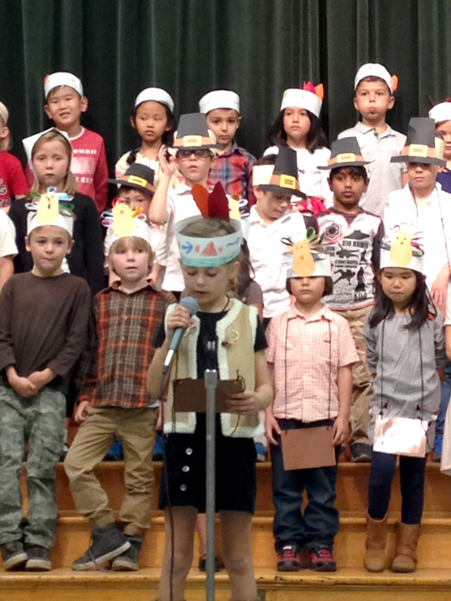 First grade students took turns and explained the origins and history of Thanksgiving and humored the audience with funny turkey songs.