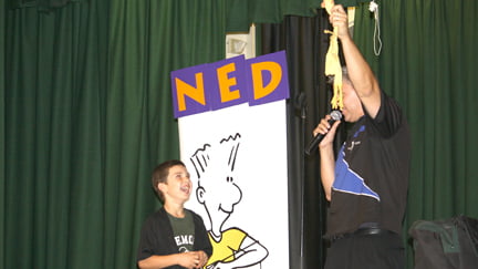 The focus of the assembly was learning how to make the right choices. With a cardboard cartoon of “Ned” standing on stage, Chris began telling the story of how Ned made his way to Fremont.