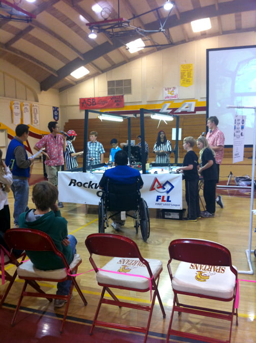 LEGOs are the world’s favorite building blocks. They’ve made everything from the Starship Enterprise to Hogwarts. But at La Cañada High School on Sunday, Nov 24, LEGOs were used to build robots. The occasion was the annual For Inspiration and Recognition of Science and Technology – FIRST – LEGO League (FLL) BlockHead Qualifier, which this year had 32 teams of up to 10 kids ages 9 to 14 from local elementary schools and Girl Scout troops competing to advance to the Los Angeles Regional Championship Tournament Dec 14 and 15. Seven of these teams were taught by Falkon Robotics 589 from Crescenta Valley High School.