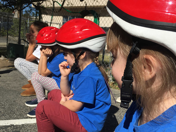 The day of the big trike-a-thon was also Grandparents Day and for the first hour the grandparents observed the projects and play that go into a typical day at CCNS. The parents arrived shortly thereafter, and the entire contingent moved to the parking lot to a racetrack lined with checkered flags and festooned with red balloons.