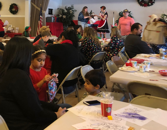 On Saturday, the La Crescenta Woman’s Club hosted its annual Breakfast with Santa. Over a hundred people came to the event and enjoyed a delicious meal of homemade pancakes and waffles, eggs, sausage, bagels, pastries, fruit, orange juice, hot chocolate and coffee. Children enjoyed a special visit and photo with Santa, and received a gift bag filled with crayons and notebooks, a small stuffed animal and a dollar coin. Kids also received a candy cane from the jolly elf. Everyone enjoyed visiting with Santa! There were no lines or crowding to get to him since a number system was in place; families could enjoy the yummy breakfast, listen to the holiday music and participate in the festive arts and crafts projects while waiting for their turn to see Santa. On tables scattered about, there were coloring pages depicting winter scenes, crayons and special note paper on which kids could write a letter to Santa to tell him that they’d been good this year. There was also room to include their Christmas wish list.