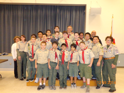 Honoring and supporting all the Scouts at the ceremony were parents, family and friends, including Assistant Scoutmasters Vinis Salazar, Margaret Metz, Roly Quizon, Dan Molina, Ralph Arellano and Harriet Hammons (BSA Verdugo Hills Council). Dawn Januzik (committee chairperson) officiated at the opening and closing of the ceremony.
