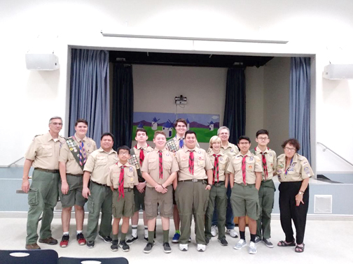 The Holy Redeemer-St. James Boy Scout Troop 317 held its Court of Honor and Christmas party on Dec. 12 at Holy Redeemer Healy Hall. Several Scouts received hard-earned merit badges and patches, including the one-of-a-kind Solar Eclipse patch of Aug. 21. For their hard work, commitment, and dedication to the ideals of scouting, Edward Vu was awarded the rank of Tenderfoot and Ethan Arellano was honored with the Life Scout rank.